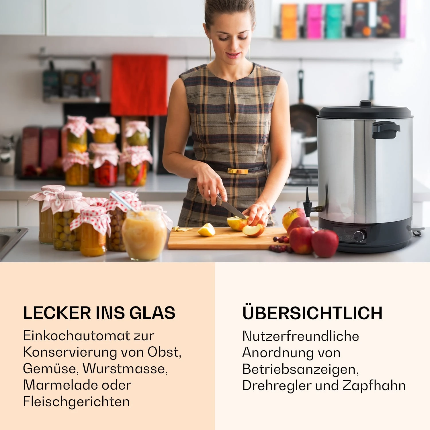 Heute wird gekocht, eingekocht! Mit dem Klarstein Abbey 40 Einkochtopf kommt Abwechslung auf den Speiseplan – mit Langzeiteffekt. Der 40 Liter große Einkocher bietet genug Platz, um den Inhalt deiner Einkochgläser mit Hitze in haltbare Konserven zu verwandeln. Egal ob die Obst- oder Gemüseernte, süße Marmeladenkreationen, herzhafte Wurstmasse oder fertig zubereitetes Gulasch, Braten und Rouladen – im Abbey 40 werden sie, dank wählbarer Temperatur von 30 – 100 °C und Einkochzeiten bis 180 Minuten, haltbar gemacht.