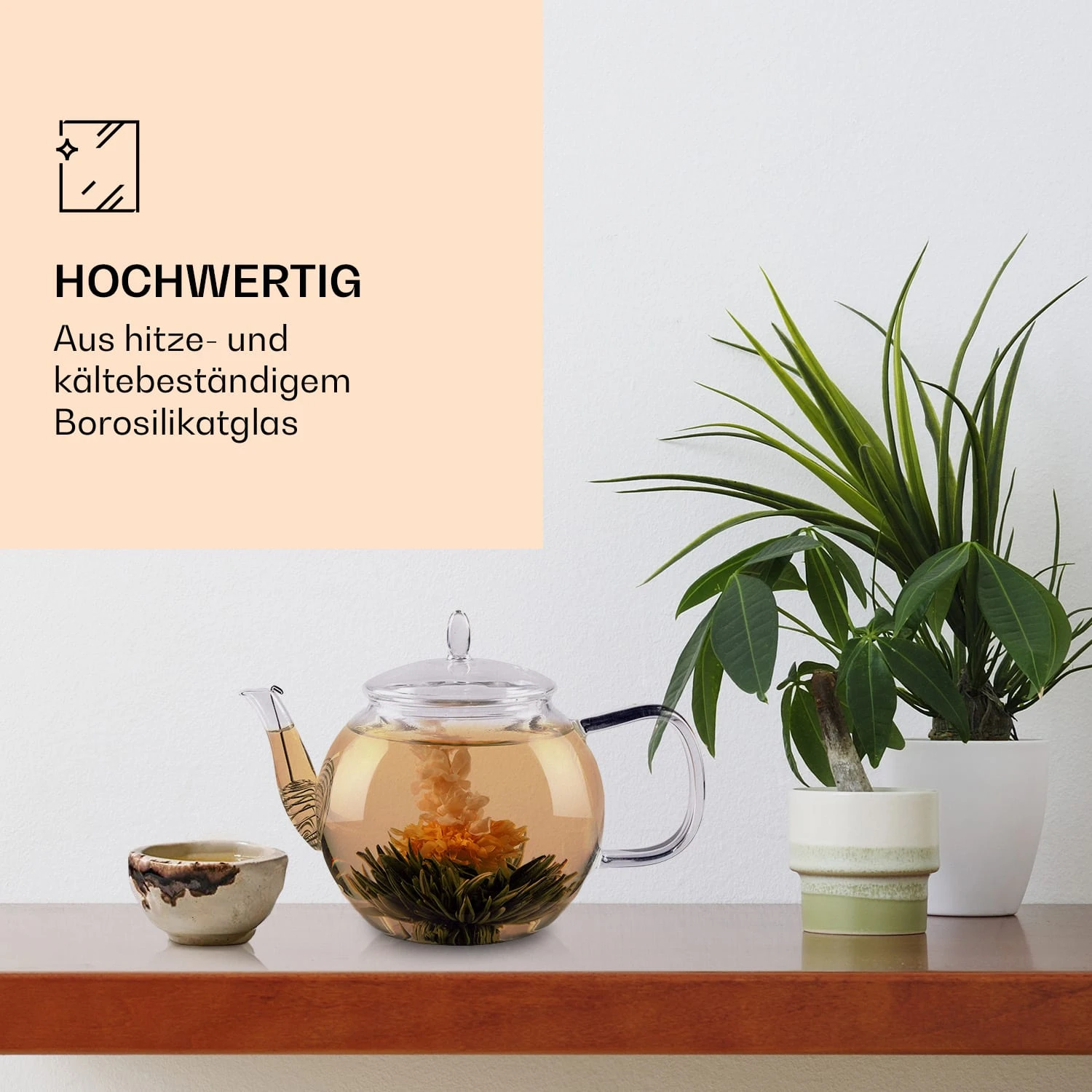 Ein verführerischer Anblick auf dem Teetisch: Die edle Glaskanne Bedida von Feelino by Klarstein versprüht durch ihre bauchige Form und den harmonisch geformten Glasdeckel pure Nostalgie. Durch die mundgeblasene Herstellung aus edlem Borosilikatglas ist hier jede Teekanne ein Unikat. Neben einzigartiger Glasqualität mit hoher Beständigkeit und guter Wärmspeicherung besticht hier auch ein praktisches und zugleich dekoratives Accessoire: Im geschwungenen Auslauf sitzt ein spiralförmiges Teesieb aus Edelstahl – so bleibt loser Tee beim Ausgießen in der Kanne. Dank des hochwertigen Borosilikatglases entsteht ein Thermoeffekt, der deinen Tee lange warm hält. Abgerundet wird die Schönheit der edlen Glaskanne hier mit exotischen Teeblumen, welche Teegenuss zu einem kleinen Kunstwerk der Natur machen: Nach dem Aufbrühen entfalten sich die Teekugeln zu farbenfrohen, prächtigen Blumen, welche durch das bauchige Glas betrachtet stark vergrößert werden. Neben dieser beeindruckenden Blumenpracht überzeugen die Teeblüten auch durch einen vollmundig aromatischen Geschmack und können für mehrere Aufgüsse verwendet werden.