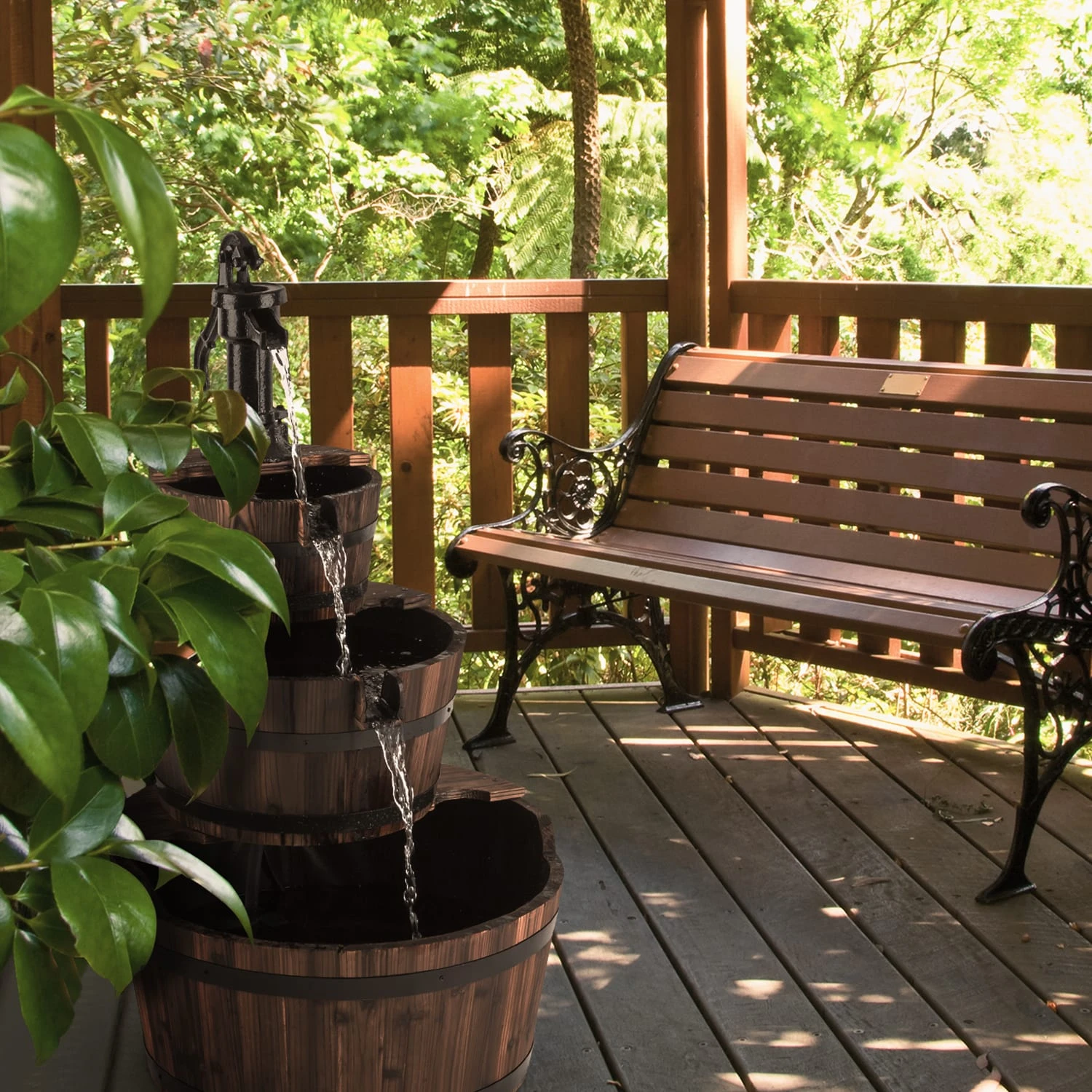 Drei Etagen aus stabilen Holzwannen, wie sie unsere Großeltern noch genutzt haben, erheben sich zu einem sich nach oben verjüngenden Turm, der von einer dekorativen Schwengelpumpe aus schwarz lackiertem Gusseisen gekrönt wird. Alle drei Fässer sind massiv aus dem schön gemaserten Holz der Spießtanne gefertigt und wurden mit einer Flammenbehandlung optisch gealtert. So fängt der Fassbrunnen perfekt die Stimmung vergangener Tage ein und hilft, eine entspannende Atmosphäre der Ruhe zu erschaffen. Damit das Wasser sicher in seinen Behältnissen bleibt und das Holz vor Fäulnis geschützt ist, sind die Bottiche von innen mit einer dicken Dichtungsschutzschicht versehen und sind zusätzlich mit Teichfolie ausgekleidet.