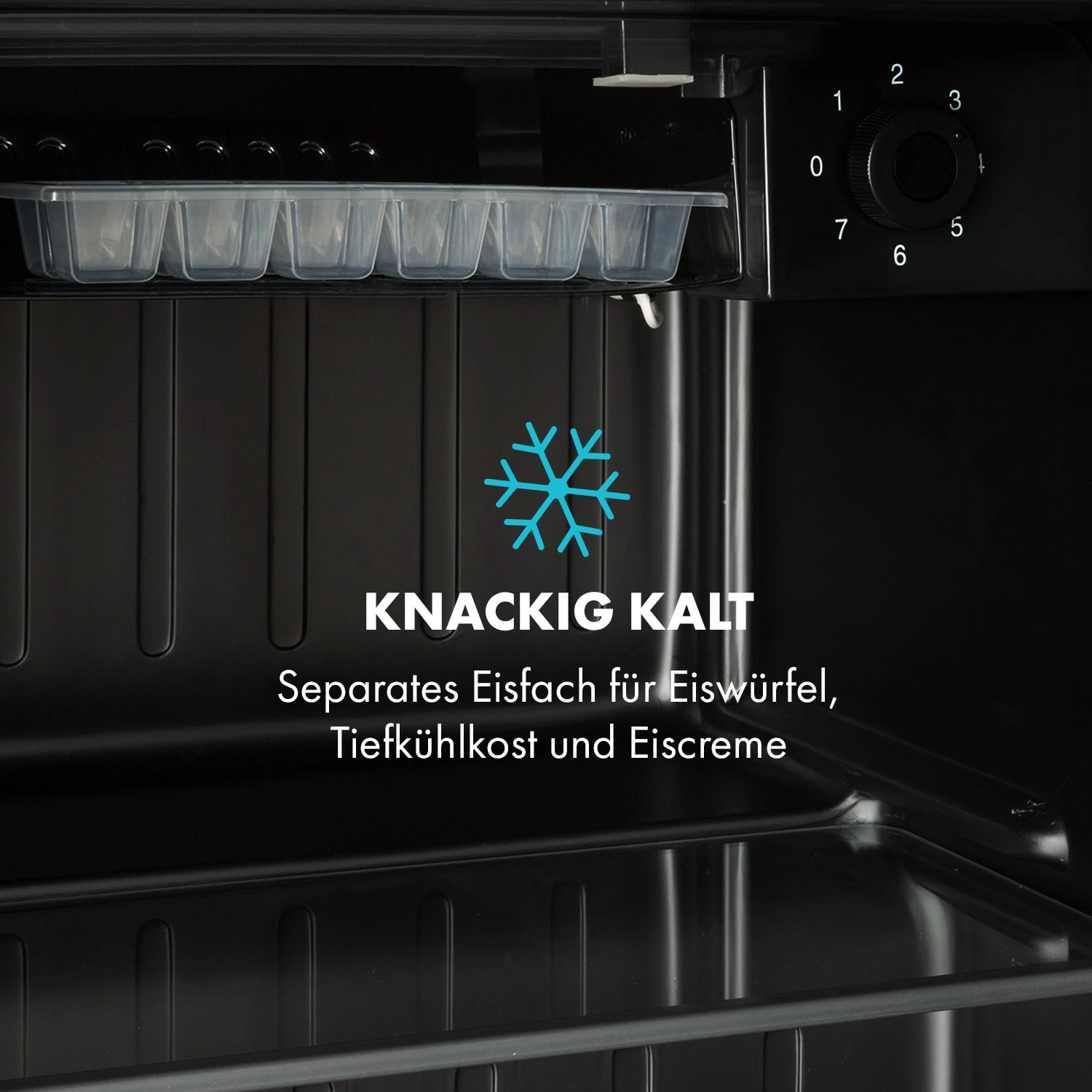 Der Comic-Superheld unter den Kompaktkühlschränken! Der Klarstein Cool Vibe 46+ Kühlschrank verfügt mit 46 Litern und 2 Ebenen über viel Platz für Lebensmittel aller Art. Zwei Türfächer bieten den nötigen Stauraum für Flaschen und Gläser. Zusätzlich hält das topseitige, separate Eisfach immer Eiswürfel, Tiefkühlkost oder Eiscreme bereit. Nicht nur mit seinem Innenleben macht der Cool Vibe 46+ seinem Namen alle Ehre: Seine Front ist mit einem erfrischenden Aufdruck im Stickerbomb-Stil gestaltet. Coole Sprüche, Emojis und freche Bilder – you name it, Cool Vibe 46+ has it!