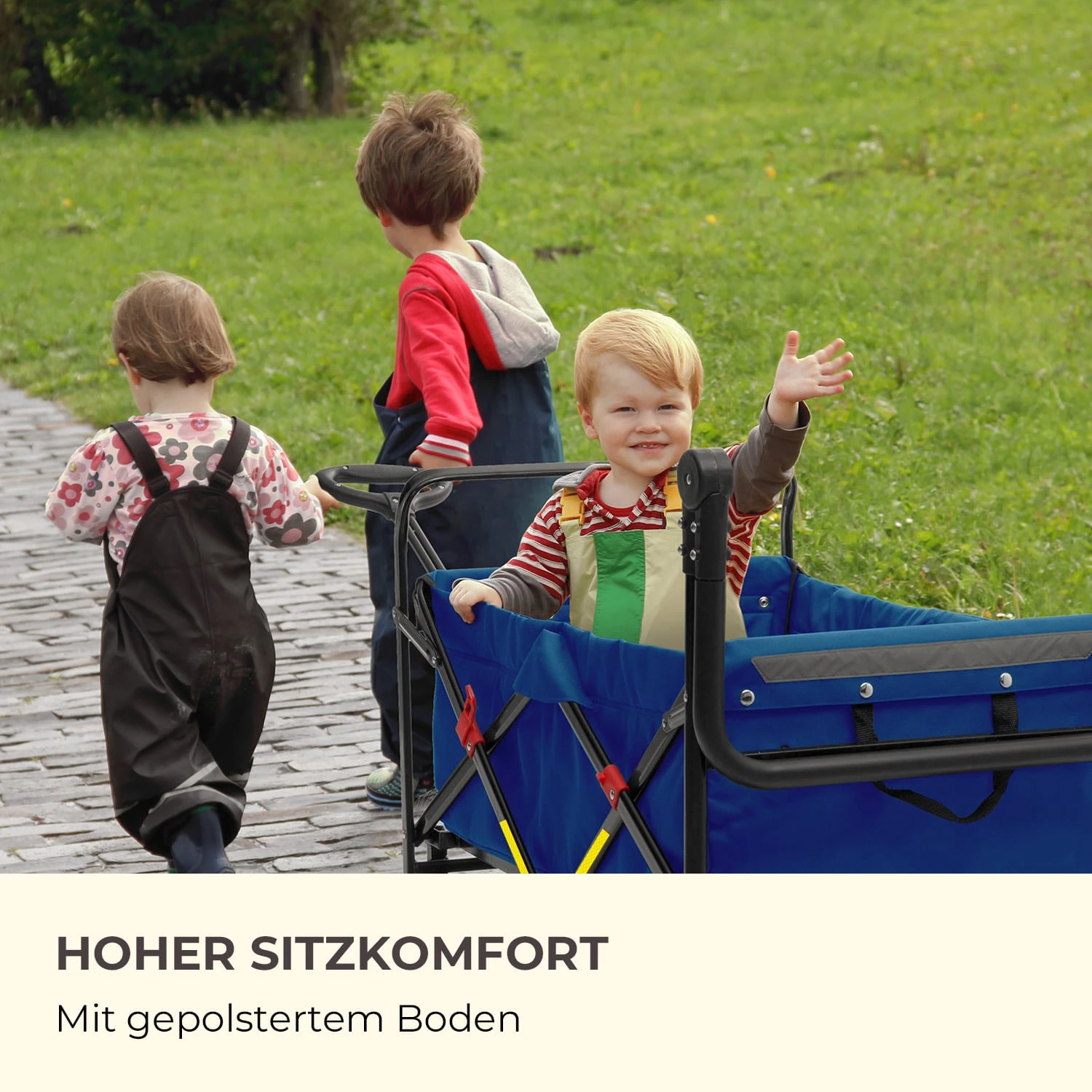 Mithilfe der ausziehbaren Teleskopstange vorne und der klappbaren Schubstange hinten lässt sich der Handwagen wunderbar einfach ziehen oder schieben. Die Räder sind frei beweglich und mit Kugellagern ausgestattet, was geschmeidiges und leichtes Fahren garantiert. Für extra Sicherheit, was vor allem beim Transport von Kindern wichtig ist, sorgen die beiden Sicherheitsgurte im Innern und die Reflektoren außen am Wagen. Dank des gepolsterten Bodens ist beim Transport jederzeit ein hoher Sitzkomfort gegeben, der allen Kindern gefallen wird.