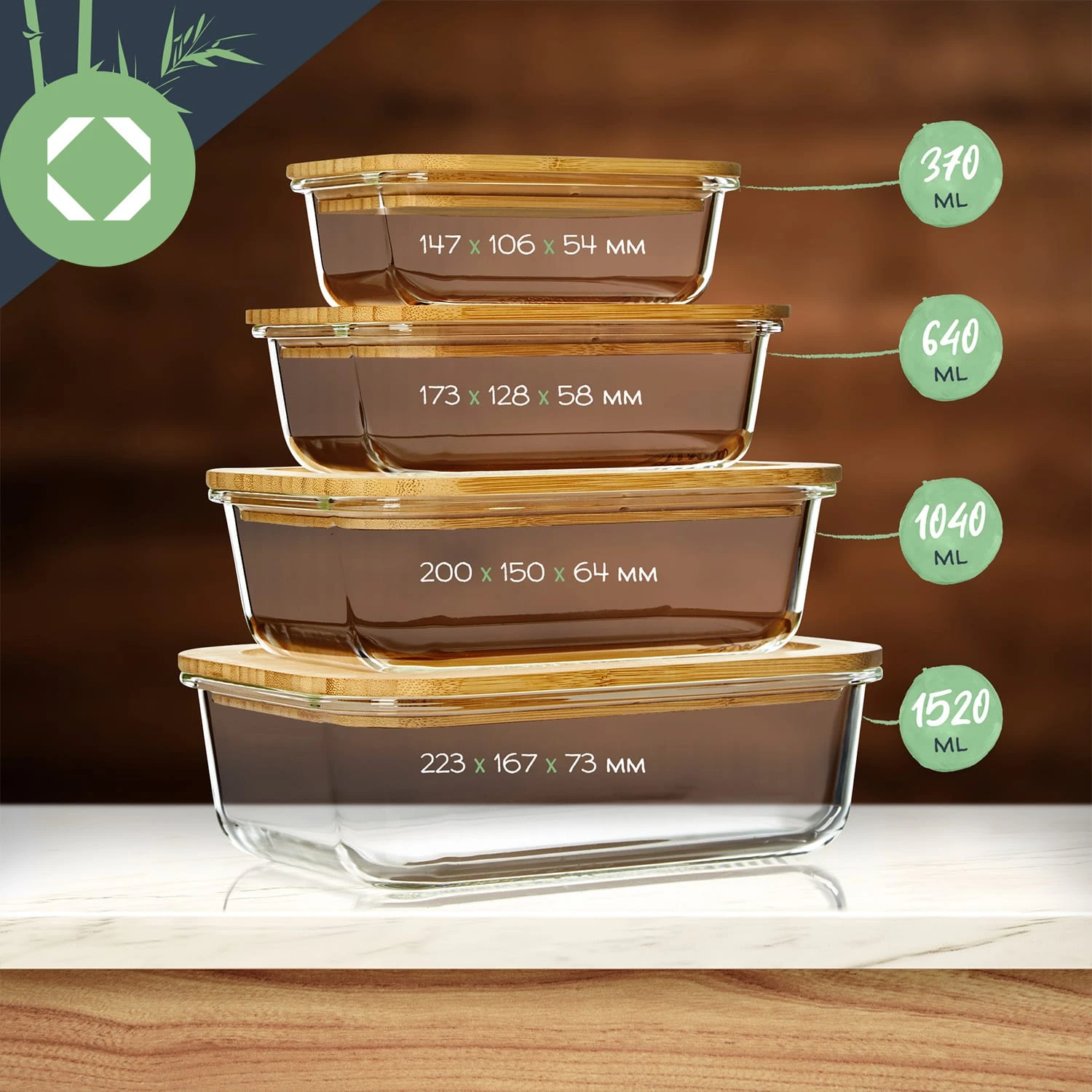 Edle Allrounder im Set: 4 Frischhaltedosen in verschiedenen Größen. Ob zum Aufbewahren von Speisen, Käse oder Wurst im Kühlschrank, von Vorräten im Regal oder auch fürs Verpacken der Pausenbrote – die Verwendungsmöglichkeiten des Sets sind fast unbegrenzt. Durch das robuste Borosilikatglas eignen sich die Vorratsdosen sogar zum Aufwärmen oder Einfrieren von Speisen. Dank dem dichten Bambusdeckel mit Silikonabdichtung bleibt alles fest verschlossen und behält lange sein Aroma. Praktisch, nachhaltig, edel: aufeinander gestapelt wird das Set zum Hingucker in deinem Küchenregal.