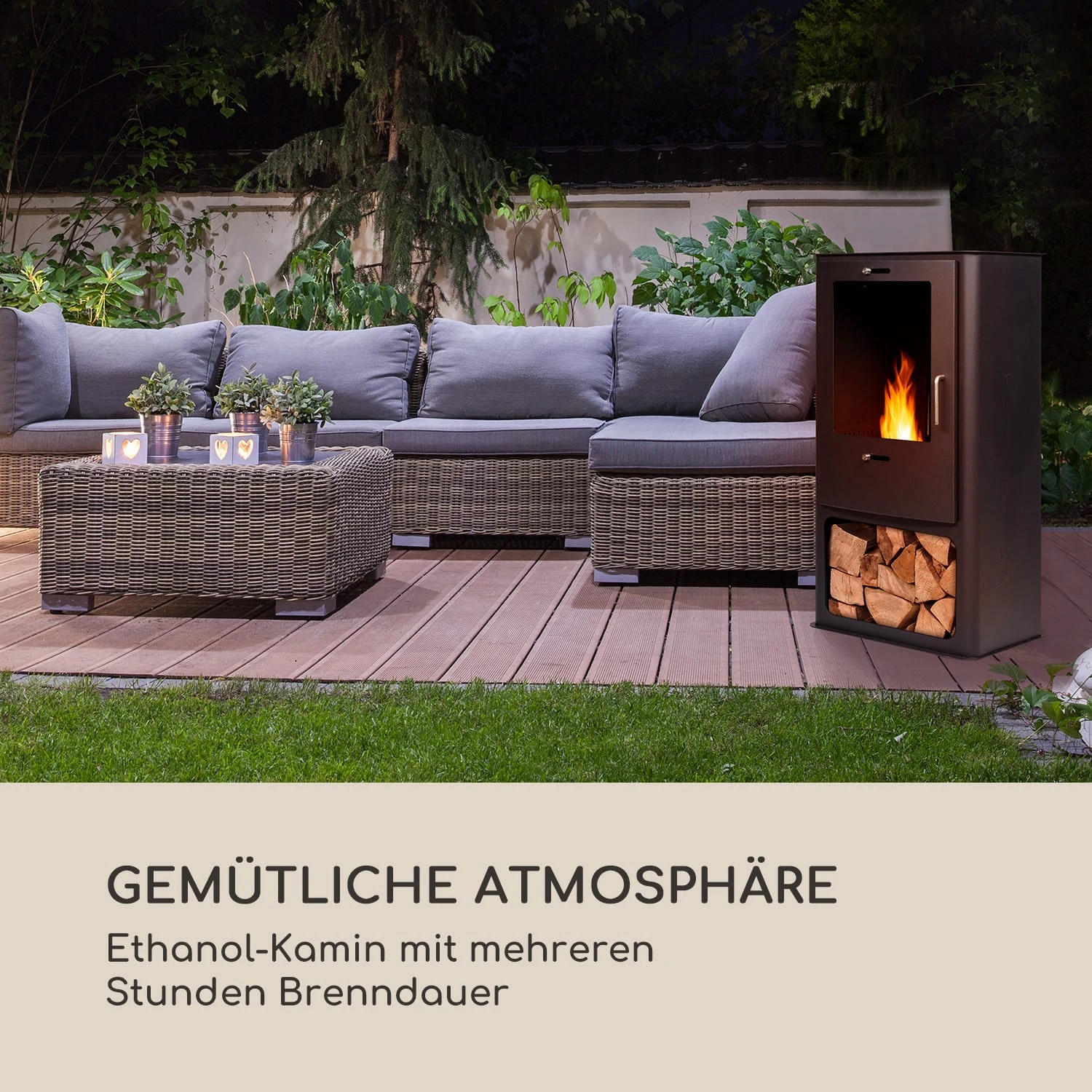 Feuer und Flamme: Der blumfeldt Fiamme Cantal Ethanol-Kamin zaubert in deinem Wohnzimmer eine wunderschöne Kaminzimmer-Atmosphäre, ohne unangenehme Gerüche zu verbreiten. Der Fiamme Cantal wird komplett mit Bio-Ethanol aus nachwachsenden Rohstoffen betrieben. Sein aus Edelstahl gefertigter Brenner fasst 1,2 Liter und sorgt für ein bis zu 6 Stunden andauerndes Flammenspiel. Sein Design ist einem klassischen Indoor-Kamin nachempfunden inklusive dekorativem Holzfach an der Unterseite. Allerdings macht der Fiamme Cantal auch vor einem Außeneinsatz keinen Halt. Sein robustes Gehäuse aus Stahlblech sowie seine Tür mit dem gehärteten Glasfenster lassen ihn auch als idealen Outdoor-Kamin auftreten. Das beiliegende Regencover schützt ihn bei Nichtgebrauch vor Wind und Wetter. Zum sicheren Löschen der Flamme ist ein praktischer Löschhaken im Lieferumfang enthalten.