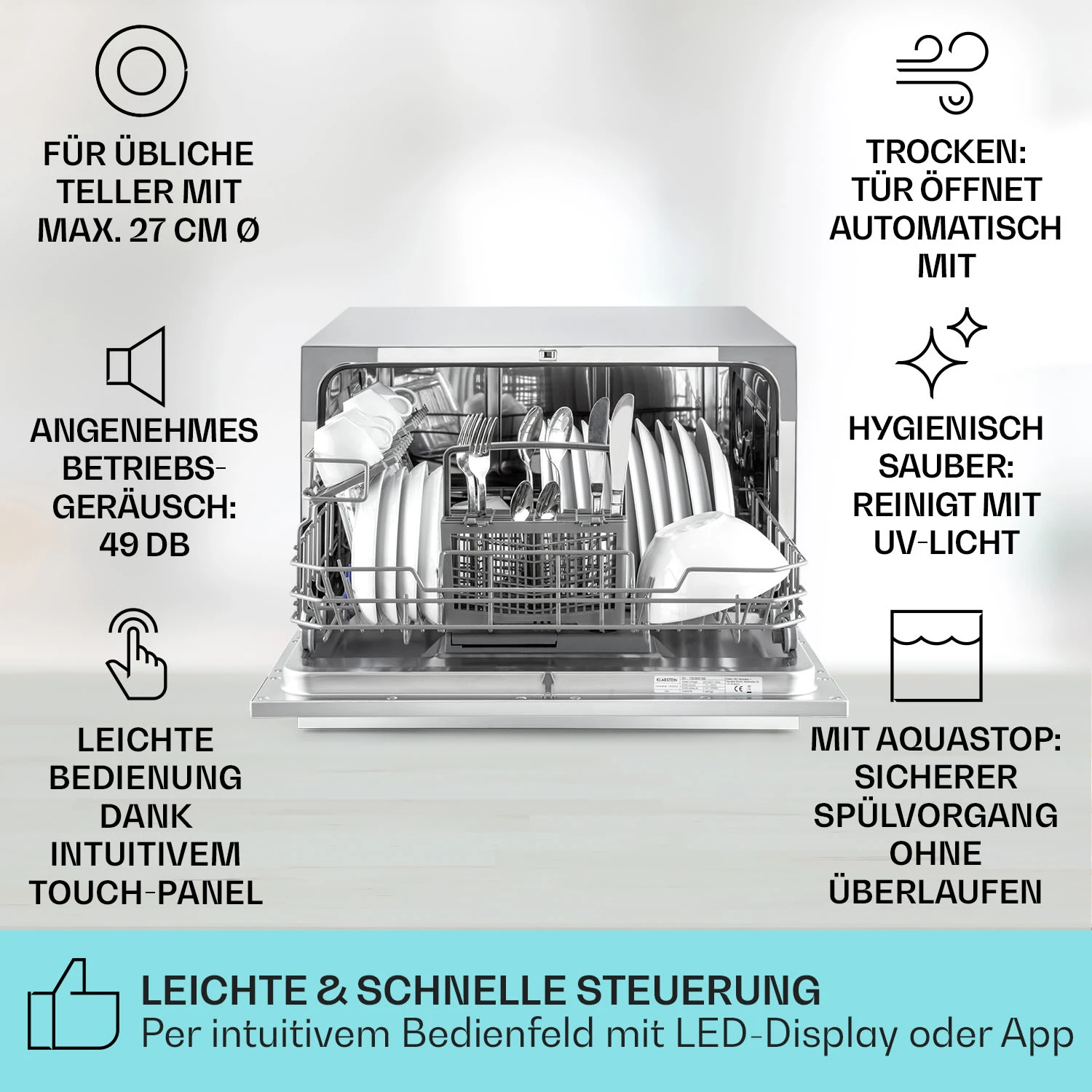 Die Klarstein Havasia UV 6 Geschirrspülmaschine ist eine überzeugende Reinigungshilfe mit vielen nützlichen Funktionen! Bis zu 6 Maßgedecke finden in ihrem Inneren Platz. Mit 1380 Watt Leistung und sechs unterschiedlichen Programmen bringt die Havasia UV 6 verschmutztes Geschirr wieder zum Glänzen. Alle Programme lassen sich schnell und einfach über die aufgeräumte Armatur mit drei Tasten einstellen. Mit automatischer Türöffnung und integriertem UV-Licht für eine besonders effiziente Säuberung erleichtert sie zuverlässig deinen Alltag. Eine eingebaute Halterung ermöglicht auch die unkomplizierte Reinigung von Wein- oder Sektgläsern. Die Havasia UV 6 ist als Einbaugerät oder Tischgeschirrspüler nutzbar.