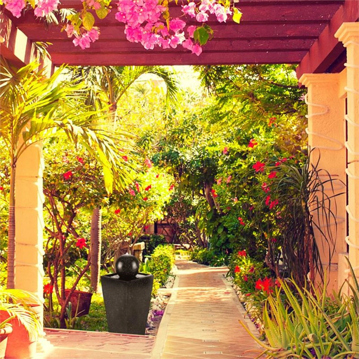 In stetem Strom sprudelt Wasser aus dem Haupt des Blumfeldt Königsbrunn Gartenbrunnens und rinnt an der Außenhaut der Kugel hinab, um aus dem versteckten Bassin seine Reise von Neuem zu beginnen. So entsteht ein optisch ansprechendes Wasserspiel, dass zu meditativer Entspannung einlädt und eine erfrischende Kulisse für Grünpflanzen oder Sitzecken bietet. Komplett aus Polyresin gefertigt verleiht ihm die Gestaltung in Form polierter Basaltblöcke einen edlen, unverwüstlichen Charme. Den unterstreicht in dunklen Stunden stimmungsvoll eine Krone aus strahlenden LED-Lichtern, die der Umgebung eine königliche Atmosphäre verleiht.