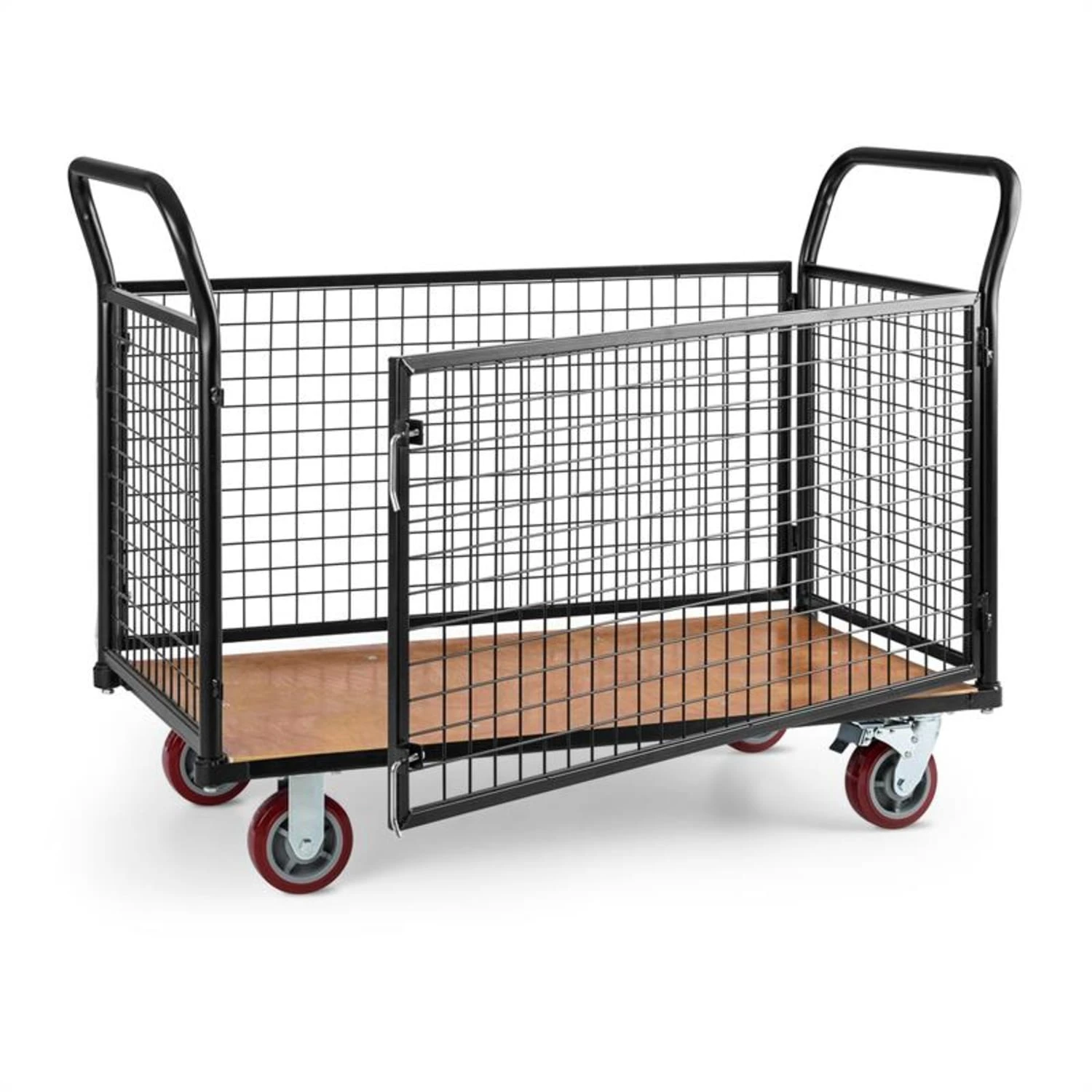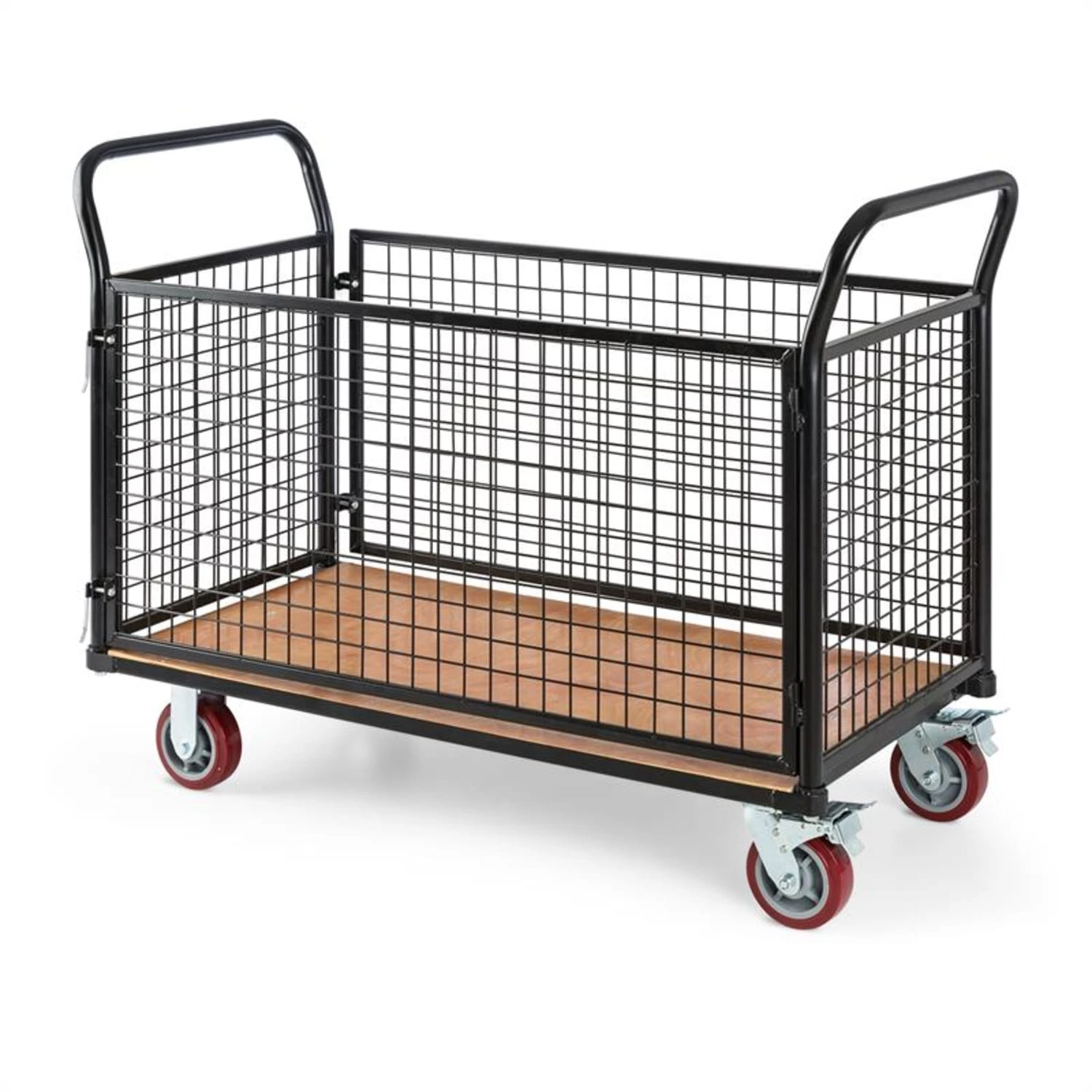 Der Waldbeck Loadster Gitterrollwagen macht aus Transportproblemen im Lager oder Logistikbereich ein Kinderspiel. Die Ausführung aus 3,8 cm dickem Stahlrohr mit Stirn- und Seitenwänden aus Drahtgittergeflecht ist extrem stabil und bewältigt Zuladungen von bis zu 500 kg Gewicht mit Leichtigkeit. Auch die massive Bodenplatte aus 3,4cm dickem, wasserfest verleimtem Multiplexholz lässt sich durch schwere Lasten nicht aus der Ruhe bringen. Der komplette Rahmen sowie die Gitterteile sind mit einer schwarzen Pulverbeschichtung versehen, die den Wagen vor Korrosion und Kratzern schützt.