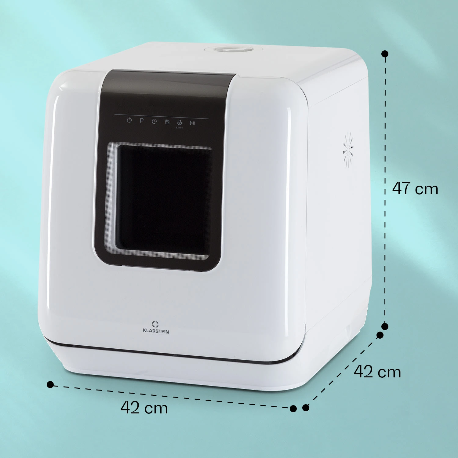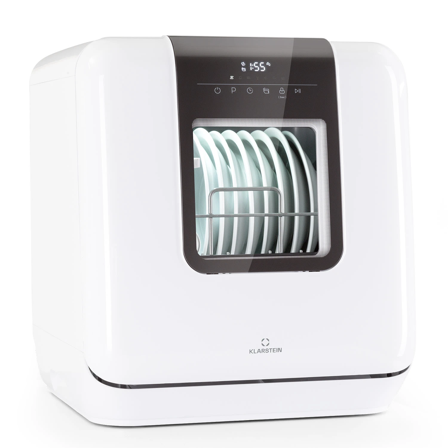 Die Klarstein Melville 3 Geschirrspülmaschine ist der perfekte Saubermacher für Besteck und Geschirr in kleinen Wohnungen oder im Wohnmobil! Mit 7 verschiedenen Programmen und nur 6 Litern Wasserverbrauch pro Spülgang rückt die Melville 3 bis zu drei Standardgedecken zu Leibe. Die Möglichkeit des wasseranschlussfreien Betriebs ist vor allem zur Nutzung in Wohnheimzimmern oder Wohnmobilen besonders attraktiv, wenn z.B. keine entsprechenden Anschlüsse zur Verfügung stehen. Ein besonders nützliches Feature ist die integrierte Trockenfunktion sowie das automatische Öffnen der Frontklappe nach dem Spülvorgang, so kann Wasserdampf entweichen und das Geschirr ist direkt schrankfertig.