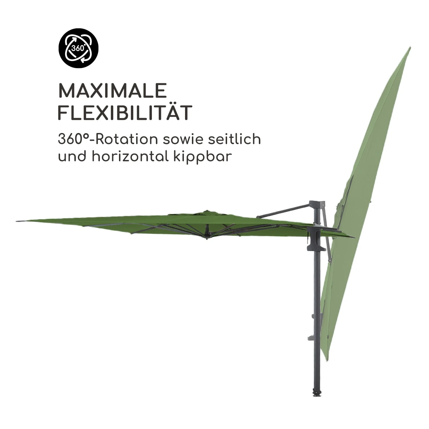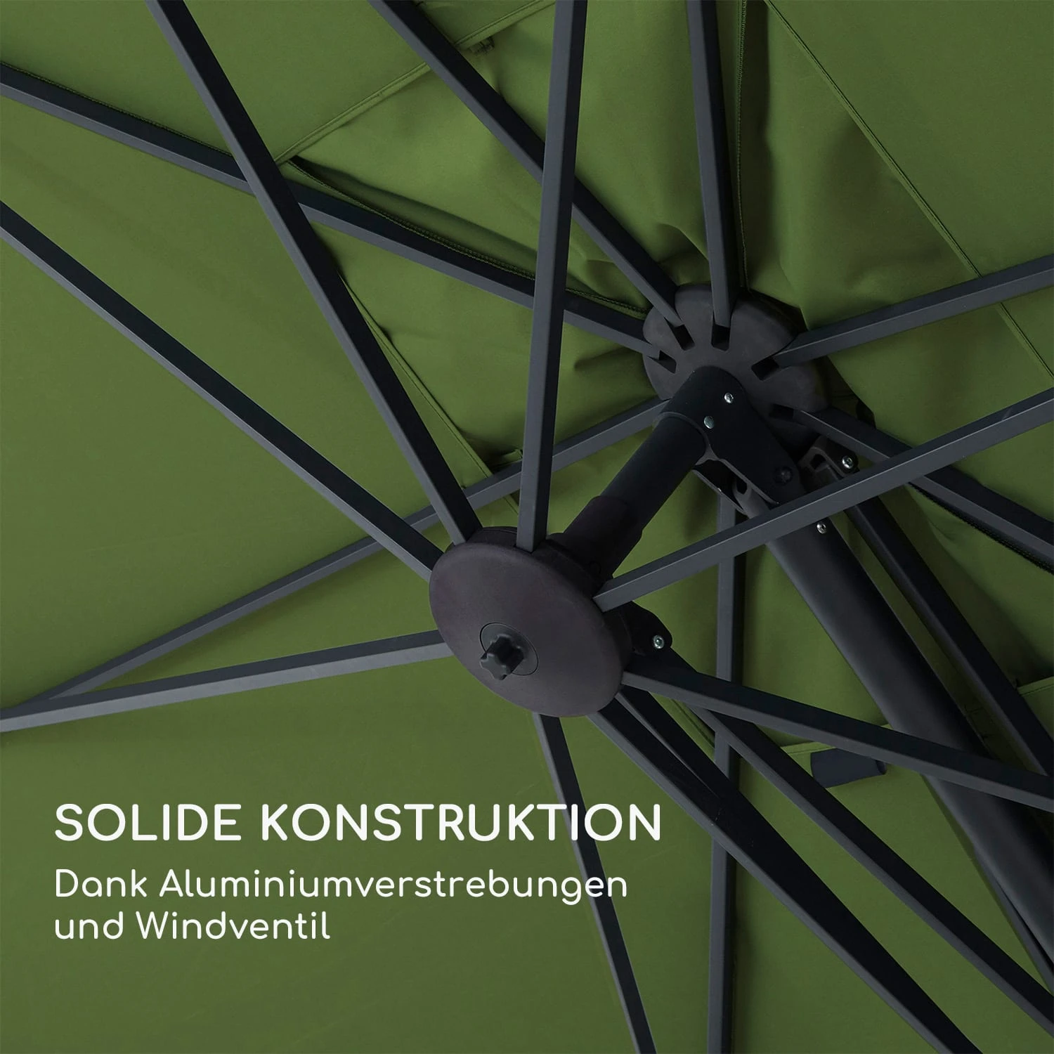 Sonnenschutz im Garten oder auf der Terrasse egal wo die Sonne steht? Mit dem blumfeldt Saint-Tropez Ampelschirm bist du dank 3-Achsen-Rotation bestens vor UV-Strahlung geschützt. Sein Fuß ermöglicht eine 360°-Drehung und das rechteckige Sonnensegel kann bequem sowohl seitlich als auch vorwärts und rückwärts gekippt werden. Somit richtest du den Schirm immer ideal zum aktuellen Sonnenstand aus, ohne ihn versetzen zu müssen. Die Bespannung besteht aus Polyamid und ist natürlich wasser- und schmutzabweisend, darüber hinaus liegt der UV-Schutzfaktor bei 50+ und schützt dich ausgezeichnet vor direkter Sonneneinstrahlung. Das Gestell des Saint-Tropez Sonnenschirms ist aus rostfreiem Aluminium, das mit einer Pulverbeschichtung überzogen ist. Hinter den stabilen Verstrebungen in der Schirmmitte findet sich ein praktisches Windventil für eine optimale Luftzirkulation.