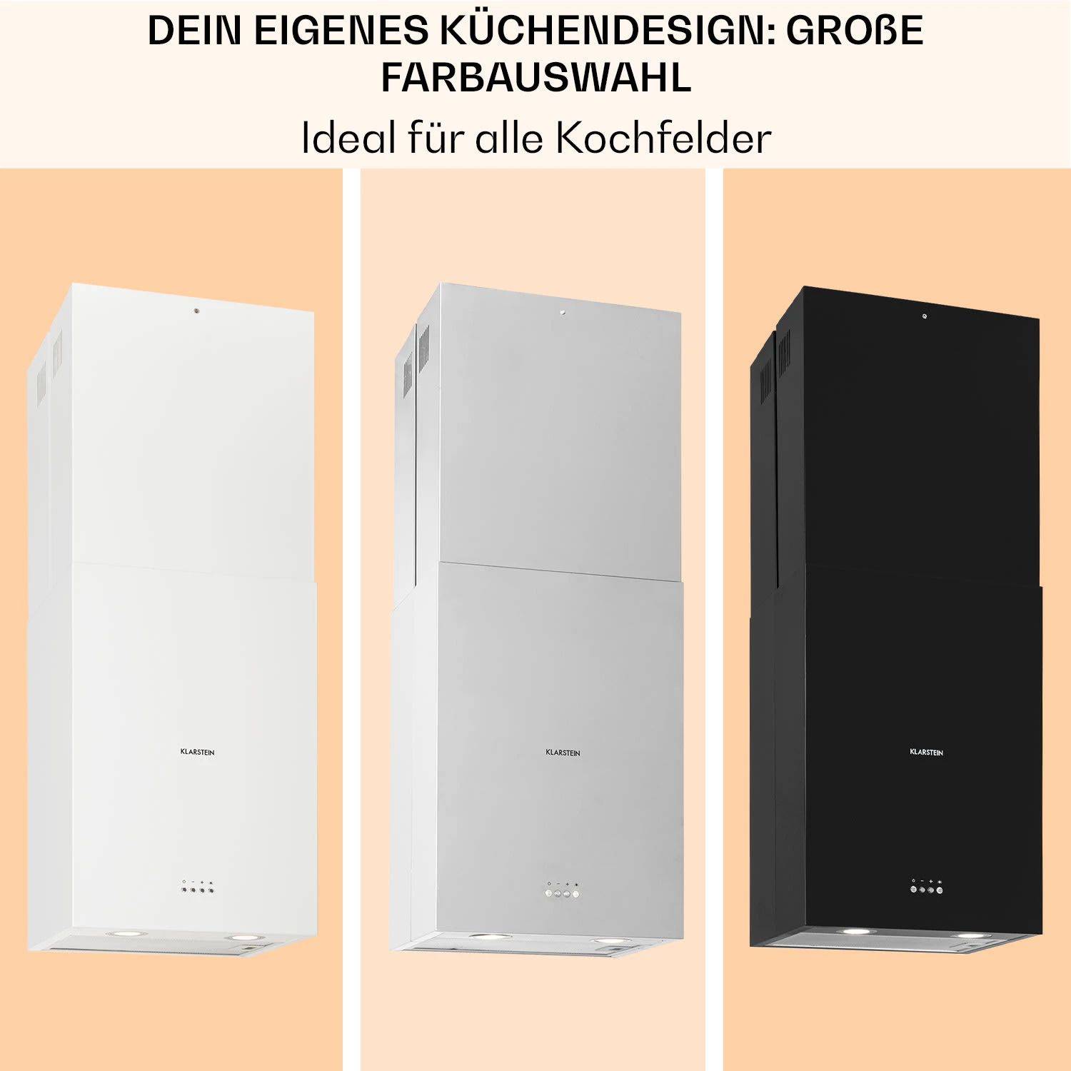 Die Abzugssäule wird stabil und sicher an der Decke befestigt und kümmert sich zuverlässig um entstehenden Küchendunst. In drei Leistungsstufen wälzt sie bis zu 624 m³/h Luft unermüdlich um und befreit so die Küchenluft von Fett und Gerüchen. Damit ist sie besonders für große Raumverhältnisse mit Kochinsel geeignet. In allen Betriebsstufen spendet eine zuschaltbare, integrierte LED-Kochflächenbeleuchtung helles, weißes Licht. Betriebsstufen und Licht werden ganz einfach über das frontseitige Bedienfeld gewählt. Die Inselhaube eignet sich sowohl zum Abluft- als auch Umluftbetrieb. Damit der Abluftschlauch dabei nicht zu sehen ist, verfügt sie über eine ca. 60 cm lange Kaminabdeckung, die sicher mit der Tragekonstruktion verbunden wird. Für den Umluftbetrieb sind optionale Aktivkohlefilter (Artikelnummer: 10030727) erhältlich, die die Luft zusätzlich von Gerüchen befreien. Absolut edel ist auch das äußere Erscheinungsbild der Klarstein Structura Inselabzugshaube. Das hochwertige, schwarze Edelstahlgehäuse verleiht jeder Kochinsel umstandslos einen edlen Glanz.