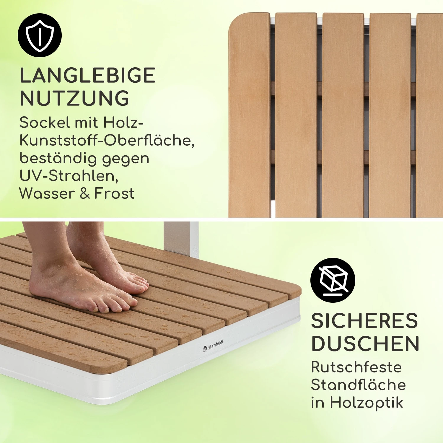 Dieses Jahr wird es ganz einfach im Garten einen kühlen Kopf zu bewahren. Dafür sorgt die Blumfeldt Sumatra Breeze Außendusche auf einfache und effektive Weise. Das kühle Erfrischungswunder wird einfach an einen Gartenschlauch angeschlossen und schon kann der Spaß beginnen. Mit einem Fußstellrad wird nicht nur das Wasser aufgedreht, sondern auch die Höhe der Fontänen bis 4 Metern reguliert. Dabei erfrischt die Dusche gleich doppelt, denn hier kommt das Wasser aus dem Boden. Einmal von untenkühl abspritzen und dann noch einmal sanft von oben berieseln lassen. Damit eignet sich die Blumfeldt Sumatra Breeze auch perfekt als Saunadusche – vor allem, da sie selbst in begrenzten Platzverhältnissen leicht einen Platz findet. Für langanhaltende Erfrischungsfreuden sorgt der clevere Mix aus robusten Materialien. Die Basis der Dusche ist aus eloxiertem Aluminium gefertigt und wird von einem rutschfesten Top aus WPC, Wood-Plastic-Composite, gekrönt. Das besteht nicht nur zu 60 % aus Holz und schont damit die natürlichen Ressourcen, es ist auch unempfindlich gegen Schimmel, Frost, Wasser und UV-Strahlung und lässt sich besonders einfach reinigen.