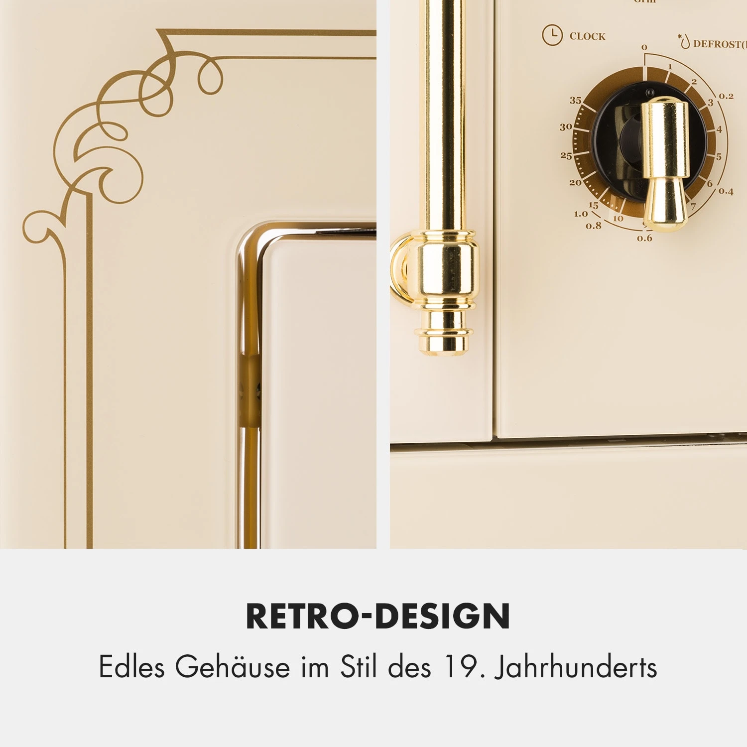 Die Klarstein Victoria 20 Einbau-Mikrowelle inklusive Einbaurahmen ist ein leistungsstarkes Allround-Talent für Single- und Familienhaushalte, das Mikrowelle und Grill zu einem multifunktionalen Gerät vereint. 800 W Mikrowellenleistung und ein 20 Liter Garraum passen das Gerät perfekt an die Bedürfnisse unserer schnelllebigen Zeit an: In 5 Stufen kann die Leistung bequem per Handgriff eingestellt werden, um in kürzester Zeit Fertigmahlzeiten zu erhitzen, Gerichte zu garen oder Zubereitetes warm zu halten. Für optimale Ergebnisse auf dem 24,5 cm Ø Glasteller wird neben der Leistungsstufe auch die Garzeit im wortwörtlichen Handumdrehen bequem reguliert. Nach deren Ablauf stoppt die Einbau-Mikrowelle und macht mit einem Signalton auf sich aufmerksam. Auf diese Weise geraten zubereitete Speisen nicht in Vergessenheit und knurrende Mägen werden rechtzeitig gefüllt. Zusätzlich besitzt die Victoria 20 einen hitzigen 1000 W Grill, der dank eines mitgelieferten Grillgitters Würstchen und Fleisch in kürzester Zeit die rechte Bräune verleiht: einfach die Grillfunktion oder per QuickSelect die gewünschte Kombination aus Grill- und Mikrowellenhitze auswählen und das Brutzelvergnügen beginnen lassen! Zum Auftauen tiefgefrorener Lebensmittel bietet die Klarstein Einbau-Mikrowelle außerdem eine Auftau-Funktion an, die es zum Kinderspiel macht, Fleisch, Geflügel oder Meeresfrüchte zu enteisen, ohne sie ungewollt durchzukochen. Im Inneren des Gerätes funkelt ein SimpleClean-Edelstahl-Interieur, das besonders resistent und einfach zu reinigen ist. Auch äußerlich macht die Victoria 20 Einbau-Mikrowelle ihrem Namen alle Ehre und besitzt ein elegantes, an das 19. Jh. angelehntes Retro-Gehäuse, das sich widerspruchslos in jedes moderne und klassische Küchenensemble einfügt.