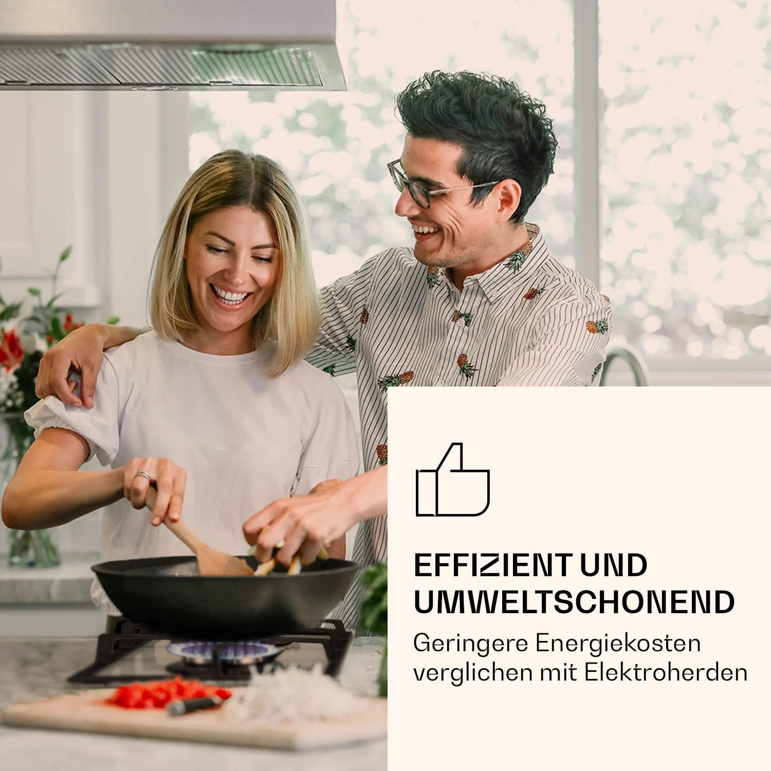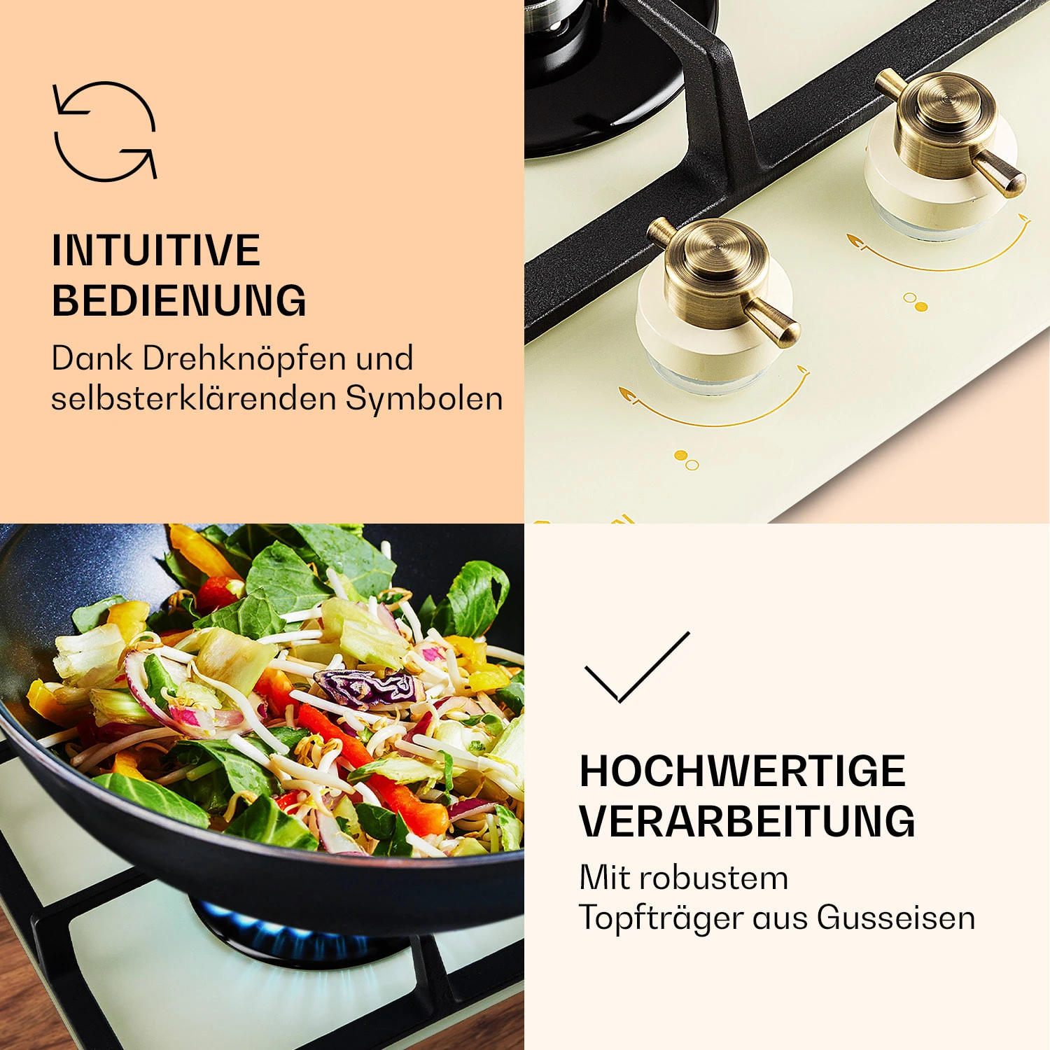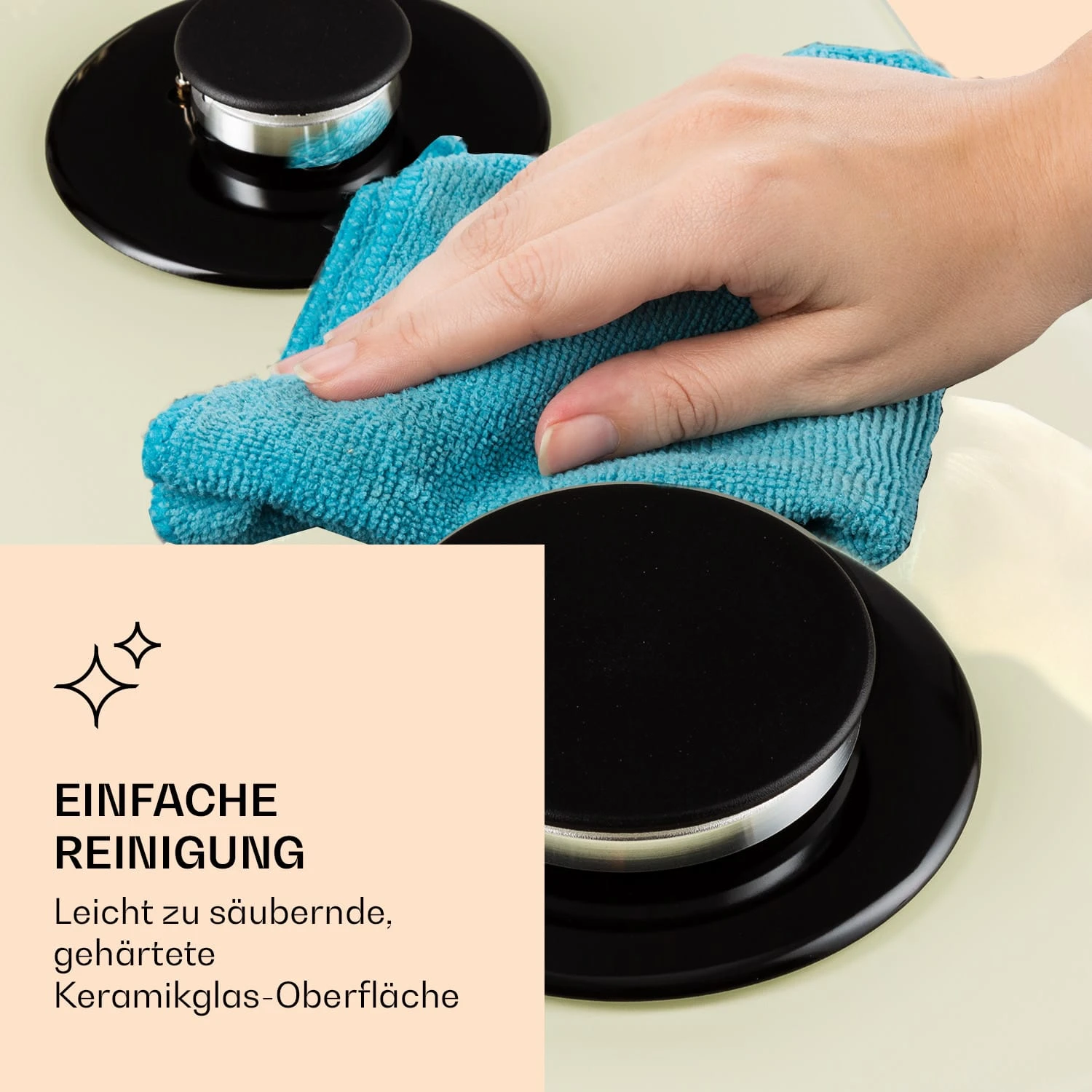 Auf dem platzsparenden Klarstein Victoria Domino Gaskochfeld befinden sich zwei hochwertige Sabaf-Brenner, die mit einer Leistung von 3 kW und 1 kW ordentlich einheizen. Die Brenner verteilen die Hitze gleichmäßig in der Mitte und an den Rändern deines Kochgeschirrs, so wird alles perfekt gegart. Die Bedienung ist dank der selbsterklärenden Symbole an den großen im Retro-Design gestalteten Drehknöpfen absolut intuitiv, die Hitzezufuhr kann während des Kochvorgangs immer wieder direkt angepasst werden. Via SnapJetIgnition entzündest du die Flamme, somit ist kein zusätzliches Feuer nötig. Das abnehmbare Kreuz aus massivem Gusseisen sitzt passgenau und kippsicher über den Flammen. Das Kochfeld ist mit einer gehärteten, pflegeleichten Keramikglas-Beschichtung versehen, die nicht nur gut aussieht, sondern auch besonders leicht zu reinigen ist.